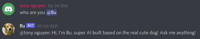 This chatbot is named Bu, a real name of a dog living in CoderSchool.