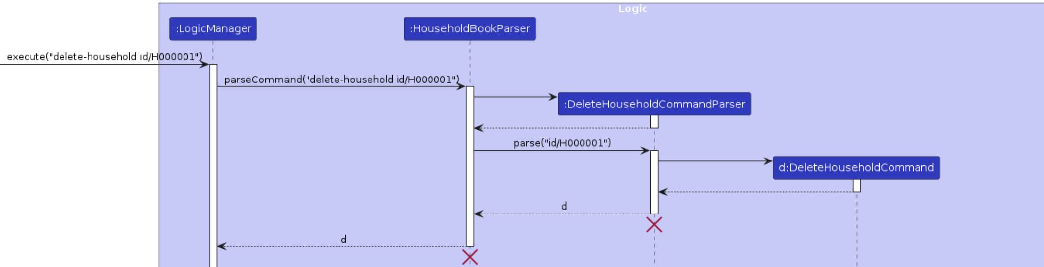 The sequence diagram for a simple delete command is missing certain methods. While trivial or very deep methods may be omitted for the sake of convenience, it should be expected for some of the intermediary commands to be shown in more detail, for example the method call between :HouseholdParser and :DeleteHouseholdCommandParser.
