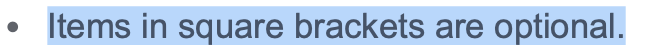This statement in the User Guide may be misunderstood as 'enclosing items within square brackets is optional'. This may lead to the user attempting to use square brackets around parameters, which do not account for this specific error and give what may appear to be an unrelated error to less aware users.