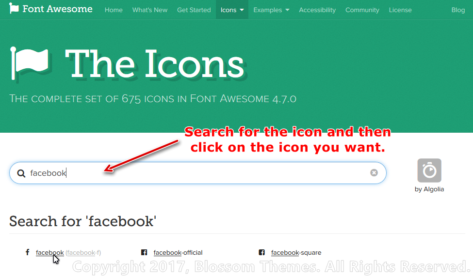 http://fontawesome.io/icons/and search for your social media icon and click on them. - In the new window copy the code shown in the image below.