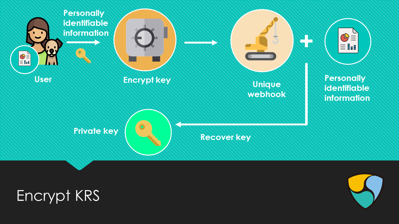 This KRS idea comprises that the user uses the KRS service to generate a private key. The key is generated based on a random seed + personal identifiable information. Furthermore, a unique webhook is generated – this can be stored without high security (e.g. in email or notes) because the webhook can only be activated to restore the keys in combination with the personal identifiable information (which is only known to the user).
