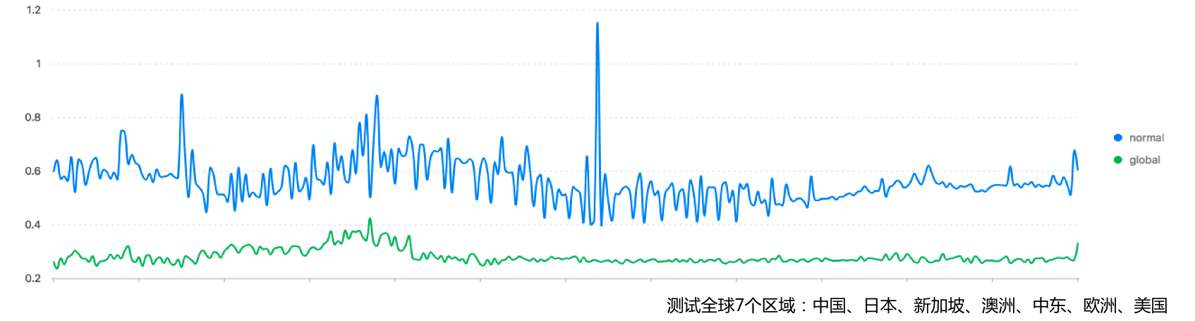 在我们的日志上传基准测试中,全球7个区域对比整体延时下降50%,在中东,欧洲、澳洲和新加坡等效果明显。除了平均延时下降外,整体稳定性也有较大提升(参见最下图,几乎没有任何抖动,而且超时请求基本为0)。确保无论在全球的何时何地,只要访问这个加速域名,就能够高效、便捷将数据采集到期望Region内。
