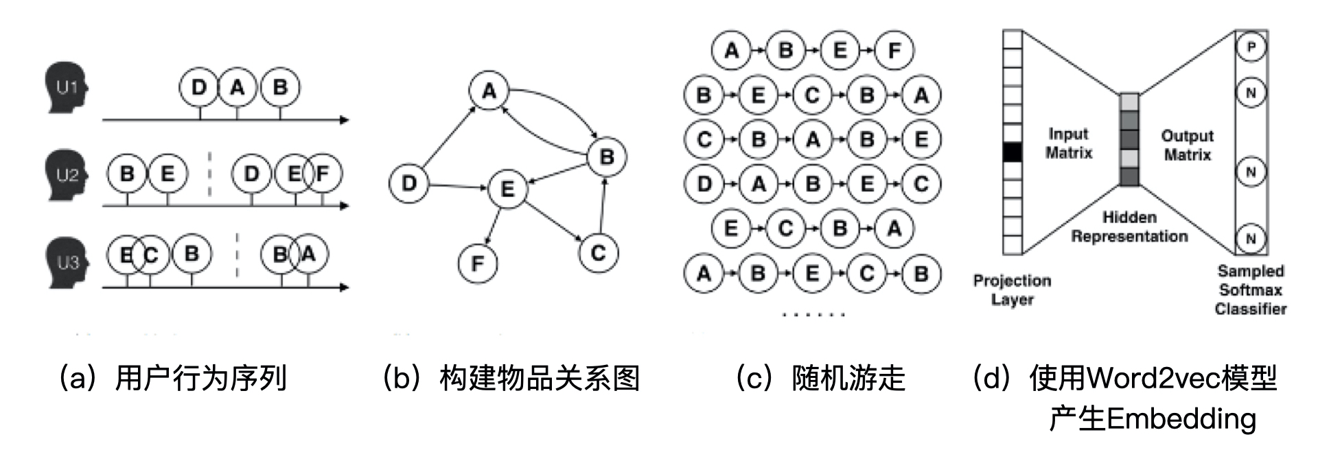 - 按照时间顺序整理用户看过的物品序列,用Word2Vec学习这个序列中上下文的相关性,得到物品隐向量。反之得到用户隐向量。