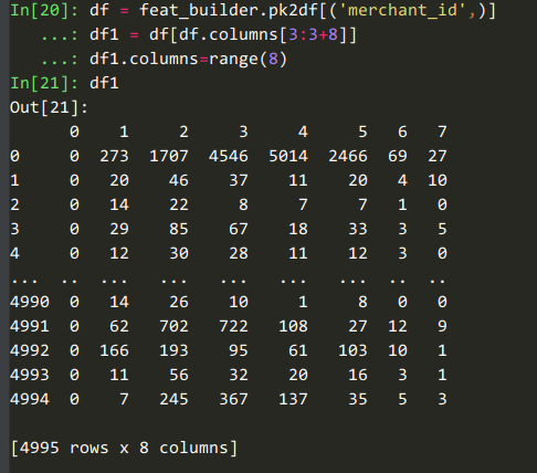 该构造器的设计哲学是以主键为核心构建与主键相关的特征列。如本赛题中,训练数据的主键为user_id, merchant_id,那么我们就可以构造出user_id, merchant_id, user_id, merchant_id 这三个特征表。