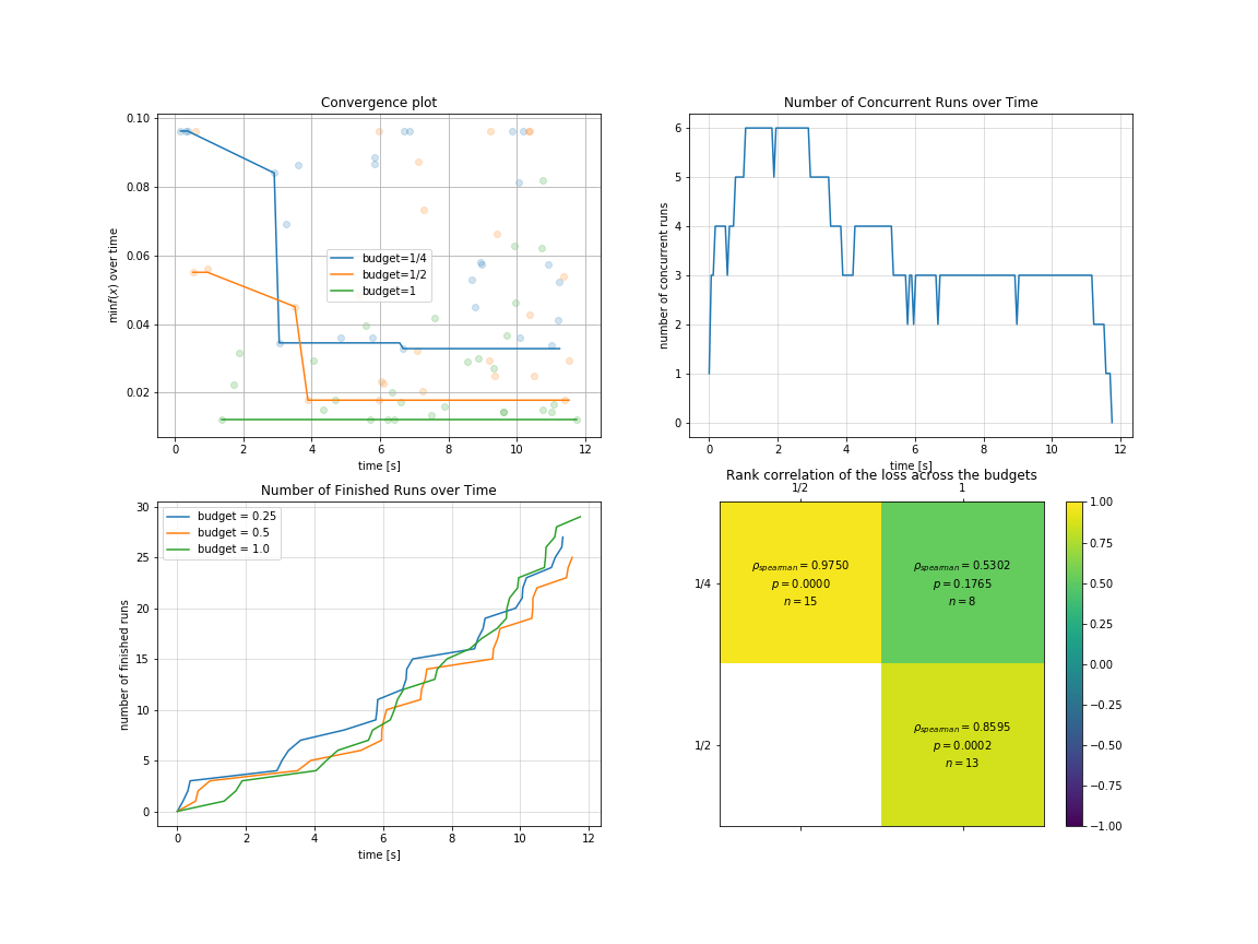 result.plot_correlation_across_budgets();We implement 4 kinds of optimizers(listed in the table below), and ETPE optimizer is our original creation, which is proved to be better than other TPE based optimizers such as HyperOpt's TPE and HpBandSter's BOHB in our experiments.
