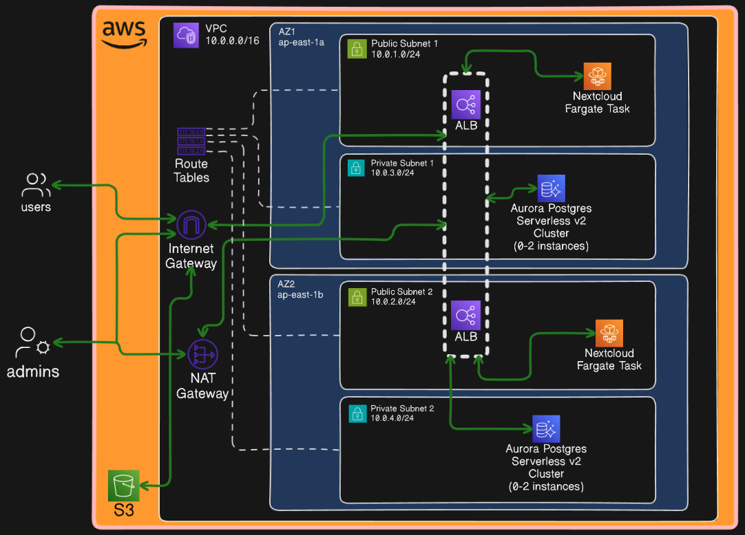 This Pulumi programme deploys a highly-available, cost-effective Nextcloud service on AWS Fargate with a serverless Aurora PostgreSQL database.