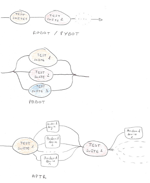 When I discovered Pabot I was very excited. But there were problems when I tried to run my android device tests simultaneously. Sometimes appium sessions were override, or reports were not created correctly. APTR is a tool that I did to simplify at maximum the parallel execution of android tests. It uses a custom pabot version to get screenshots in reports.