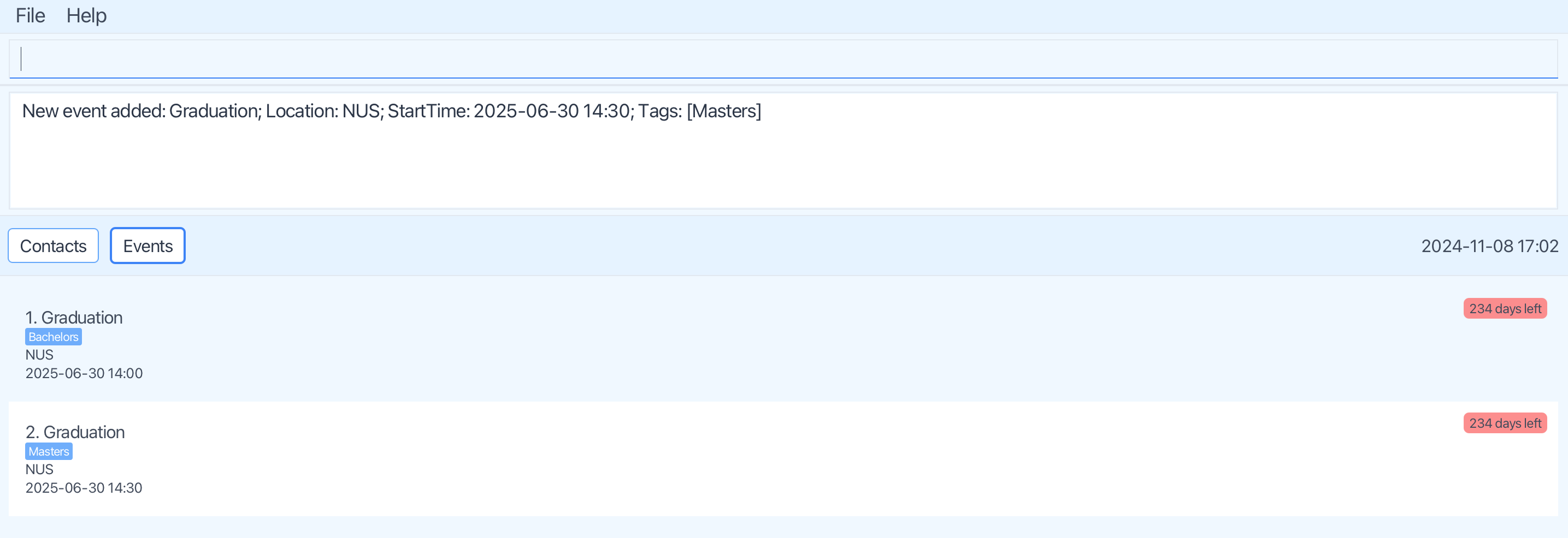 I first created 2 events, representing the Graduation ceremonies for the bachelors and master's students at NUS. Note that this is just an arbitrary example I came up with.