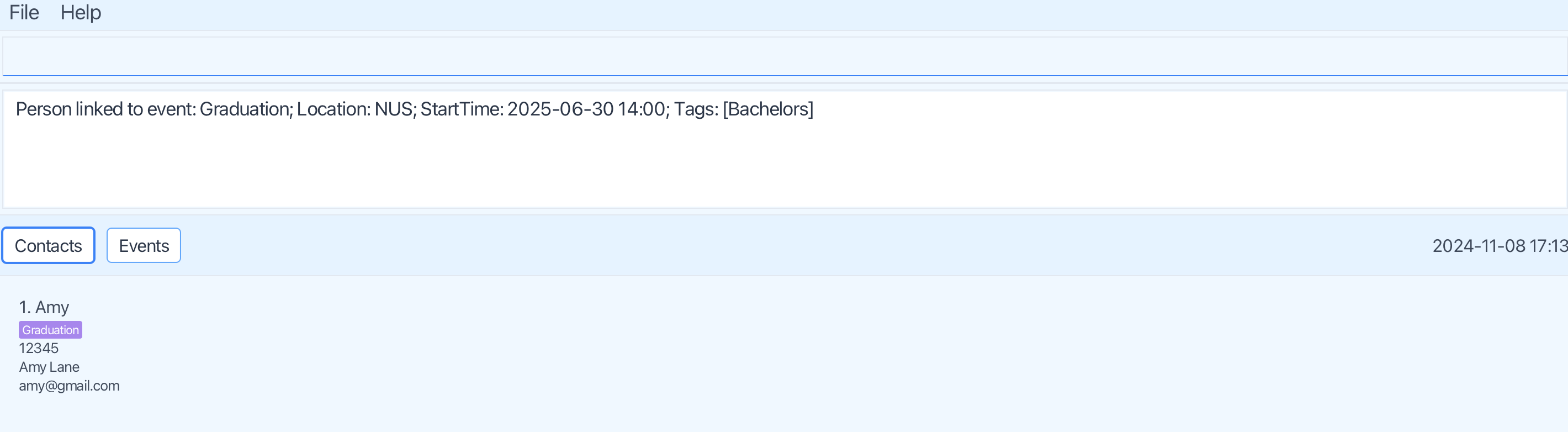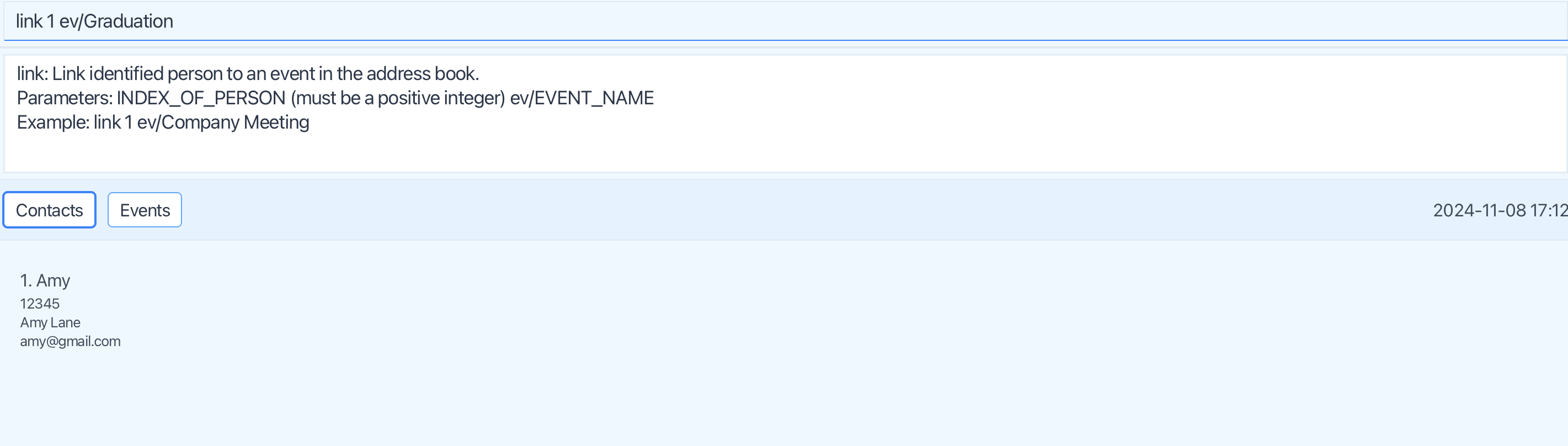 Next, I tried to assign a person, Amy, to an event with name Graduation, by using the command link 1 Graduation: