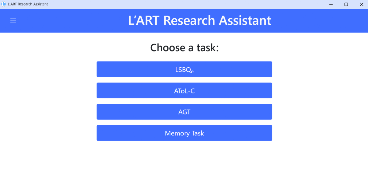The L’ART Research Assistant is a freely available open-source app that aids researchers in the collection, storage and transfer of data for research in bilingualism and language attitudes, especially in cases of bilinguals who speak a majority language and a regional / minority / minoritized language.