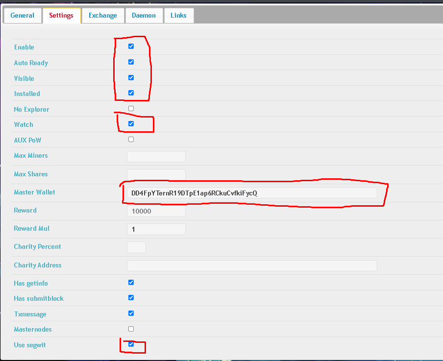 - In settings, enable the boxes: enable, auto ready, visible, installed, and watch, below them configure the character of the pool (must be generated by wallet-qt or coind ex: ./coind-cli getnewaddress ) in case of dogessed needs enable use segwit too