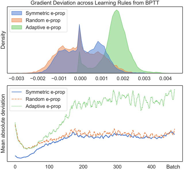 python examples/mnist_manhattan.pyCompare the gradients from BPTT with the three varients of e-prop:
