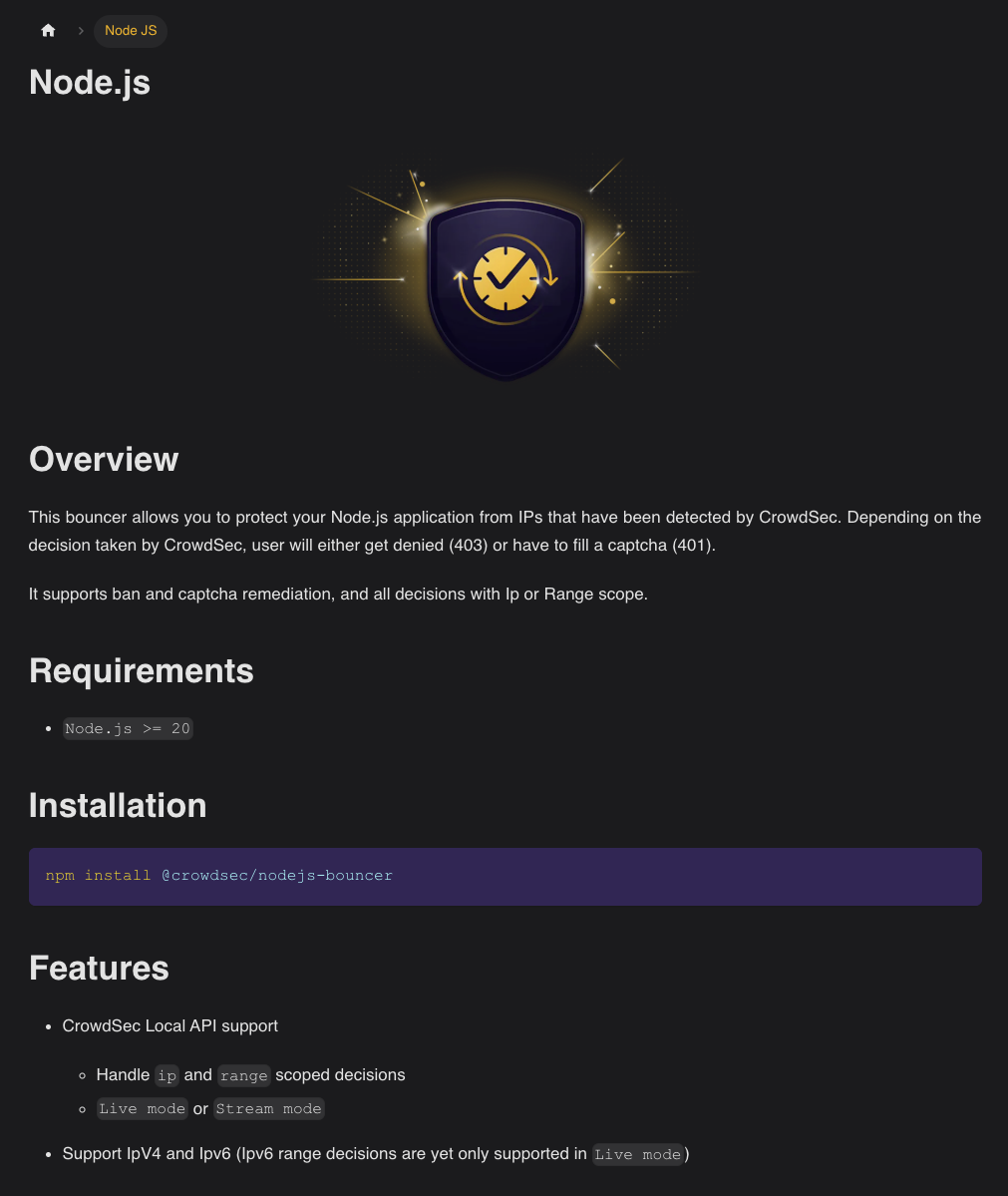 Either we make this doc page a "clone" of https://github.com/crowdsecurity/nodejs-cs-bouncer/blob/main/docs/USER_GUIDE.md