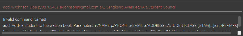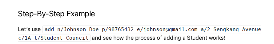 add n/Johnson Doe p/98765432 e/johnson@gmail.com a/2 Sengkang Avenuec/1A t/Student CouncilRefer to page 14 of UG