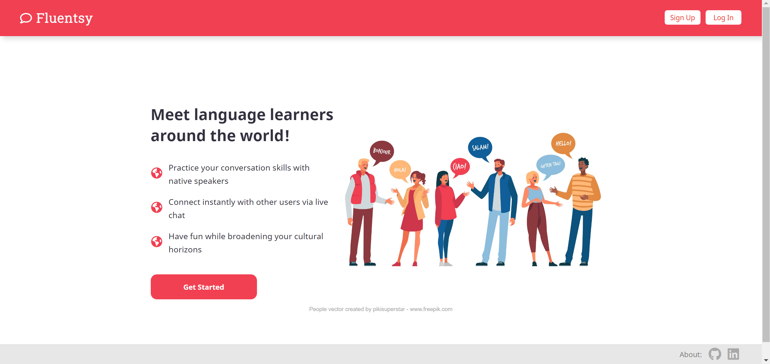 When first visiting, users are greeted by a splash page that offers brief descriptions of the sorts of interactions they can expect to have on the app. There is also a charming image created by pikisuperstar and downloaded from www.freepik.com which features cartoon people greeting one another in various languages. The splash page also has clearly accessible buttons for signing up or logging in if one already has an account, and about links in the footer, one which leads to this github repository and one which leads to my LinkedIn page.