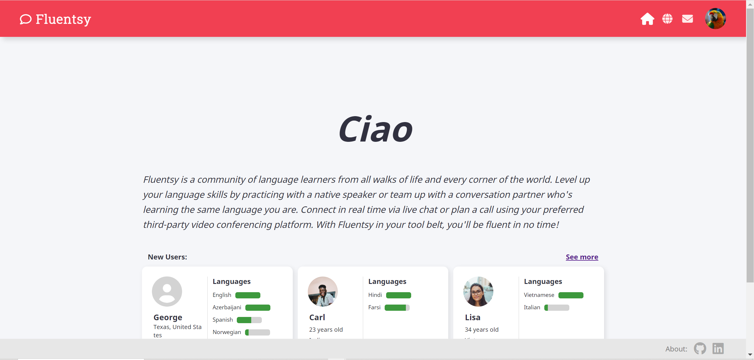 Once a user has logged in, they will be directed to a home page that displays an animation that cycles through greetings in different languages. Below that is a paragraph describing the purpose of the app, followed by a section that displays new users.
