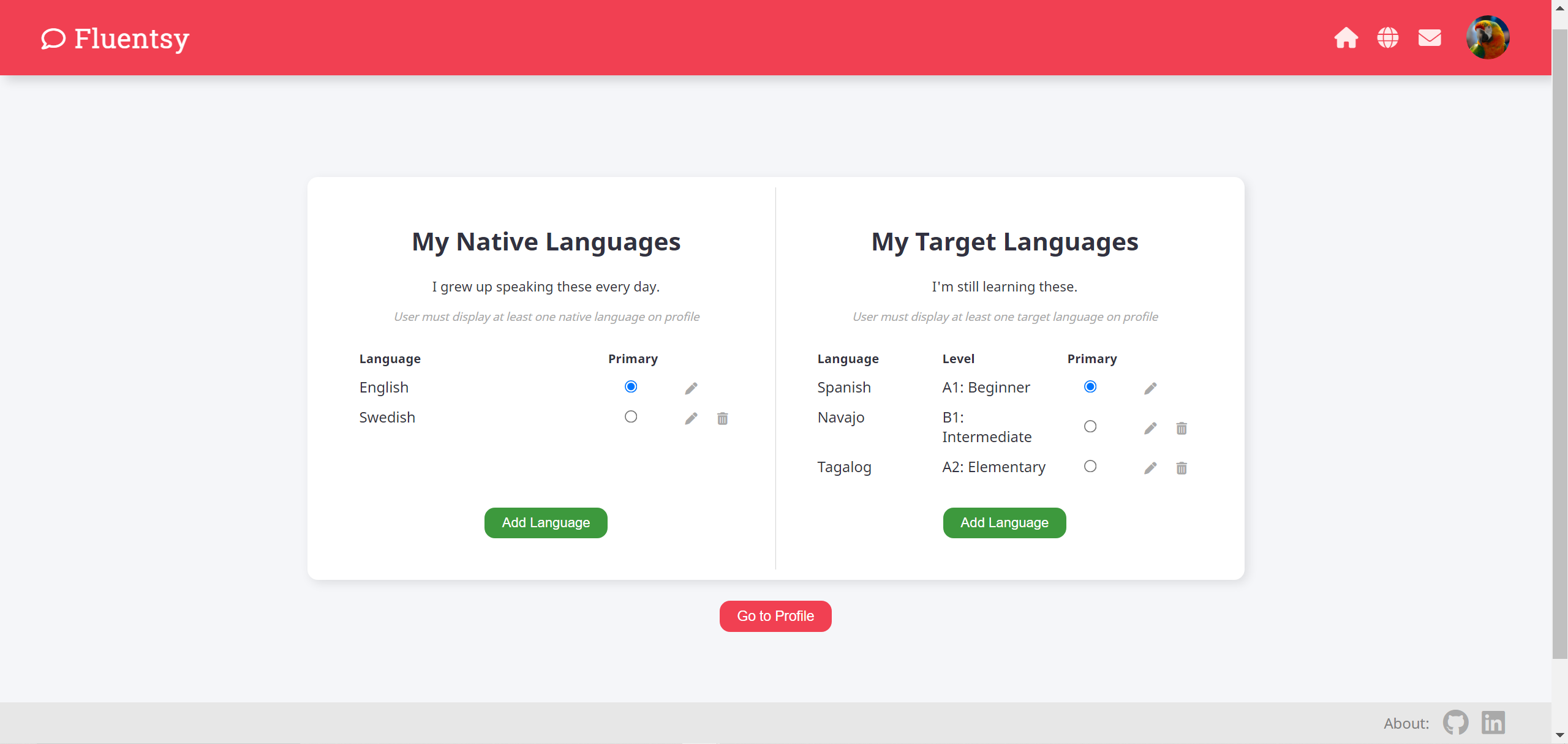 On the languages page, users can view, add, update or delete languages. Languages are divided into native languages and target languages. Each user with a profile is required to display at least one native language and at least one target language. Therefore, a user may not delete a primary native language or a primary target language. However, it is easy to update which languages are listed as primary.
