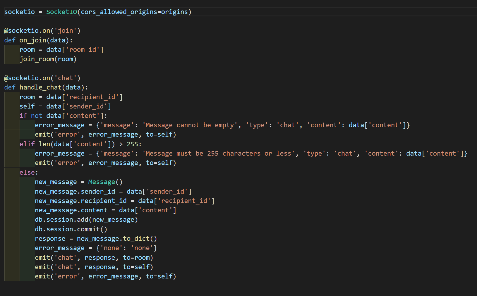 One aspect of this project that was initially challenging was learning how to implement web sockets for my live chat feature. To achieve the desired result, I used a combination of Flask-SocketIO on the backend and the socket.io-client package on the frontend. Rather than the api route handlers I am used to writing on the backend, I instead created an instance of the SocketIO object and created event handlers that listen for specific events being emitted from the frontend. I also had to learn about the concept of rooms, so that I could have the backend event handlers only emit responses to the appropriate parties. I'm glad I overcame the difficulty of learning something new, and I look forward to broadening my knowledge of web sockets, so that I can use them again in future projects.