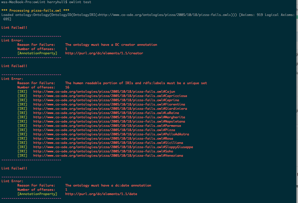 $ owlint someOwlFile.owl | Only lint someOwlFile.owl (You can also use absolute paths for files)
