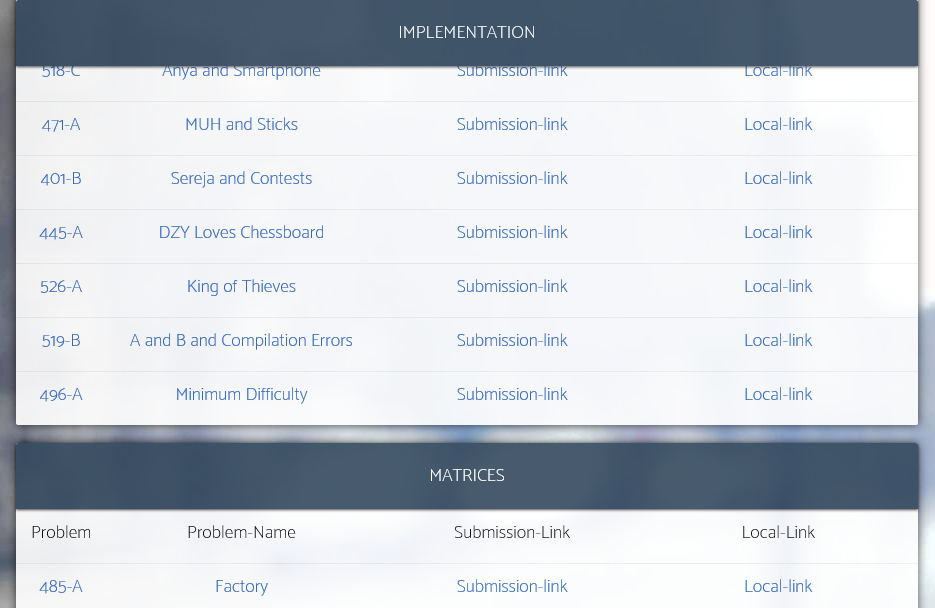 Initial version includes categorization of problems, fetching local copy of Codeforces submissions and generating HTML page providing appropiate links.