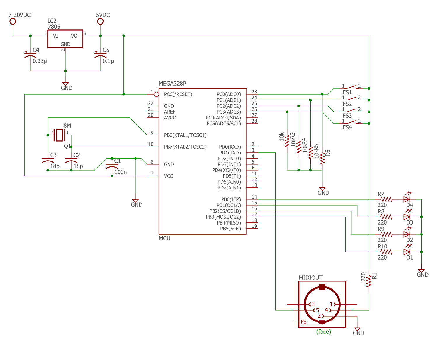 A MIDI footswitch module doesn't need a lot of components: the MCU, a few capacitors (for decoupling and to support the crystal oscillator), a crystal oscillator (I used 8 MHz), pull-down resistors (10 kΩ) and the actual switches. The MIDI output also needs a 220 Ω resistor and a socket. If you want LEDs to indicate each footswitch's current state, you also need a few more resistors to limit the current.