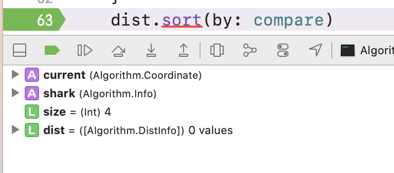 63번째 줄에 들어간 직후에는 dist 배열 안에 값이 들어있다. <img width="383" alt="Screen Shot 2021-04-04 at 5 03 56 PM" src="https://user-images.githubusercontent.com/60229909/113502522-bf626980-9567-11eb-8314-193fa467a55e.png"> 그런데, 정렬을 하려고 하는 순간, 배열 안에 값이 전부다 사라져 버려서 `sort` 함수를 사용할 수 없다. <img width="383" alt="Screen Shot 2021-04-04 at 5 05 11 PM" src="https://user-images.githubusercontent.com/60229909/113502544-ec168100-9567-11eb-967a-410ecd95c4e9.png"> <img width="452" alt="Screen Shot 2021-04-04 at 5 05 18 PM" src="https://user-images.githubusercontent.com/60229909/113502548-f0429e80-9567-11eb-9a9a-bc3a494f0565.png"> `sorted`도 마찬가지이다. <img width="503" alt="Screen Shot 2021-04-04 at 5 12 31 PM" src="https://user-images.githubusercontent.com/60229909/113502709-f2592d00-9568-11eb-9c52-726dcd62463c.png"> <img width="452" alt="Screen Shot 2021-04-04 at 5 05 18 PM" src="https://user-images.githubusercontent.com/60229909/113502548-f0429e80-9567-11eb-9a9a-bc3a494f0565.png">