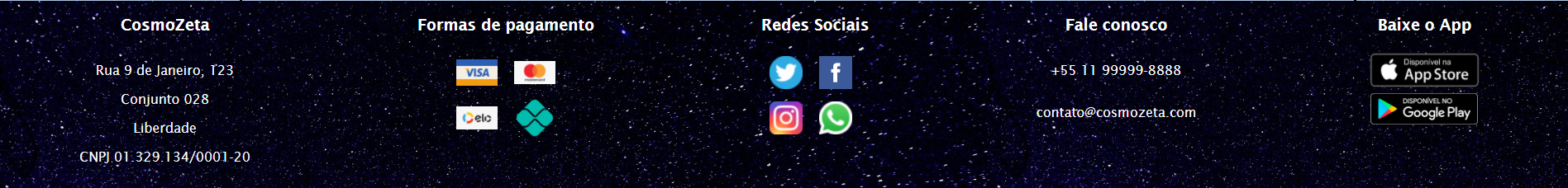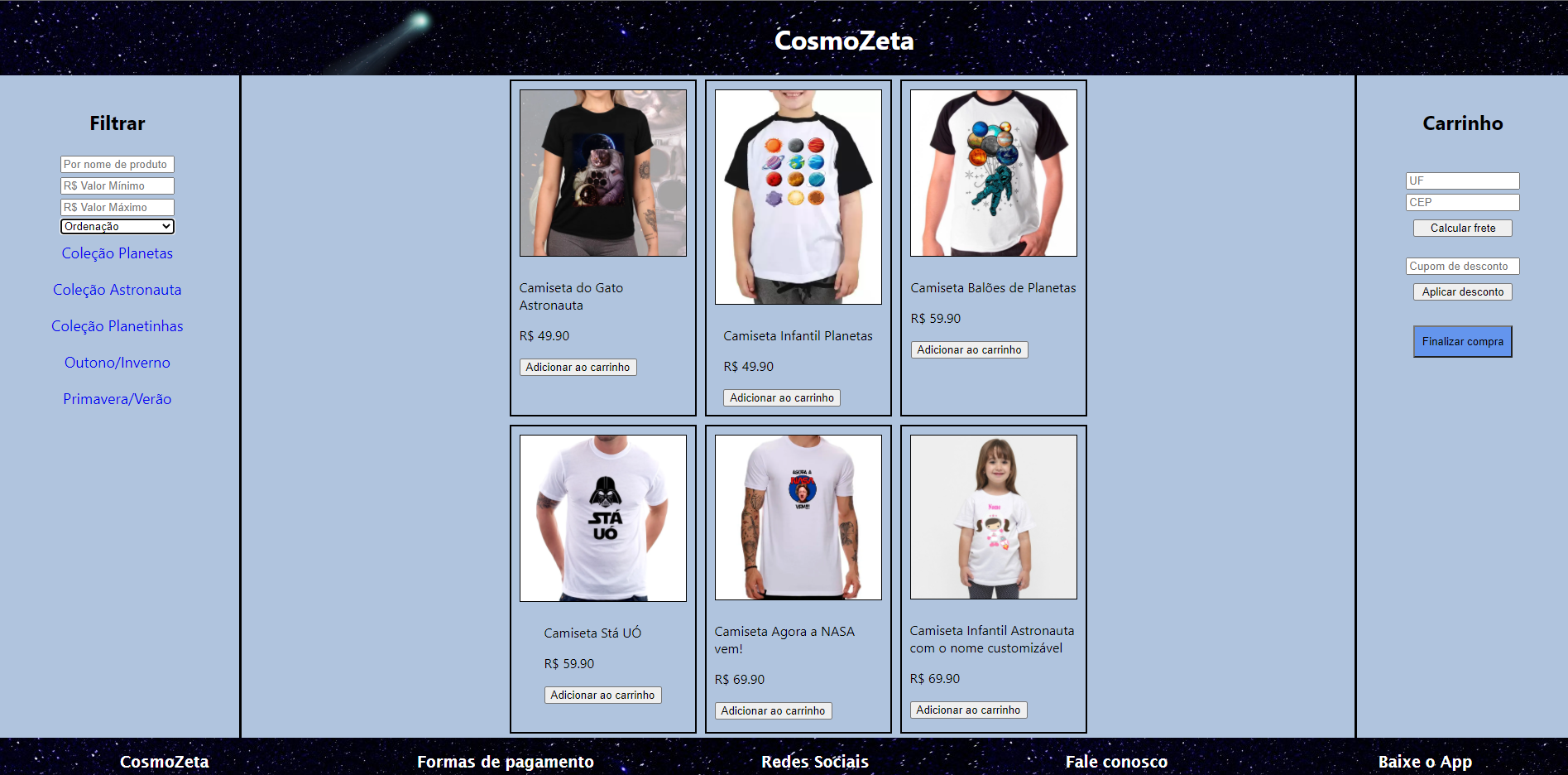 O nome do nosso projeto é CosmoZeta, um e-commerce de camisetas temáticas espaciais. Nosso projeto foi feito em React JSX.