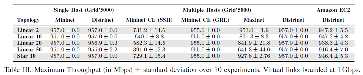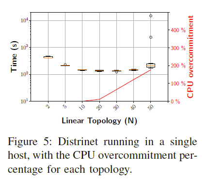 Distrinet evaluates performance from three perspectives: the execution time of emulations; the network throughput compared with Mininet, Mininet CE, Maxinet; and running behavior under high load. |