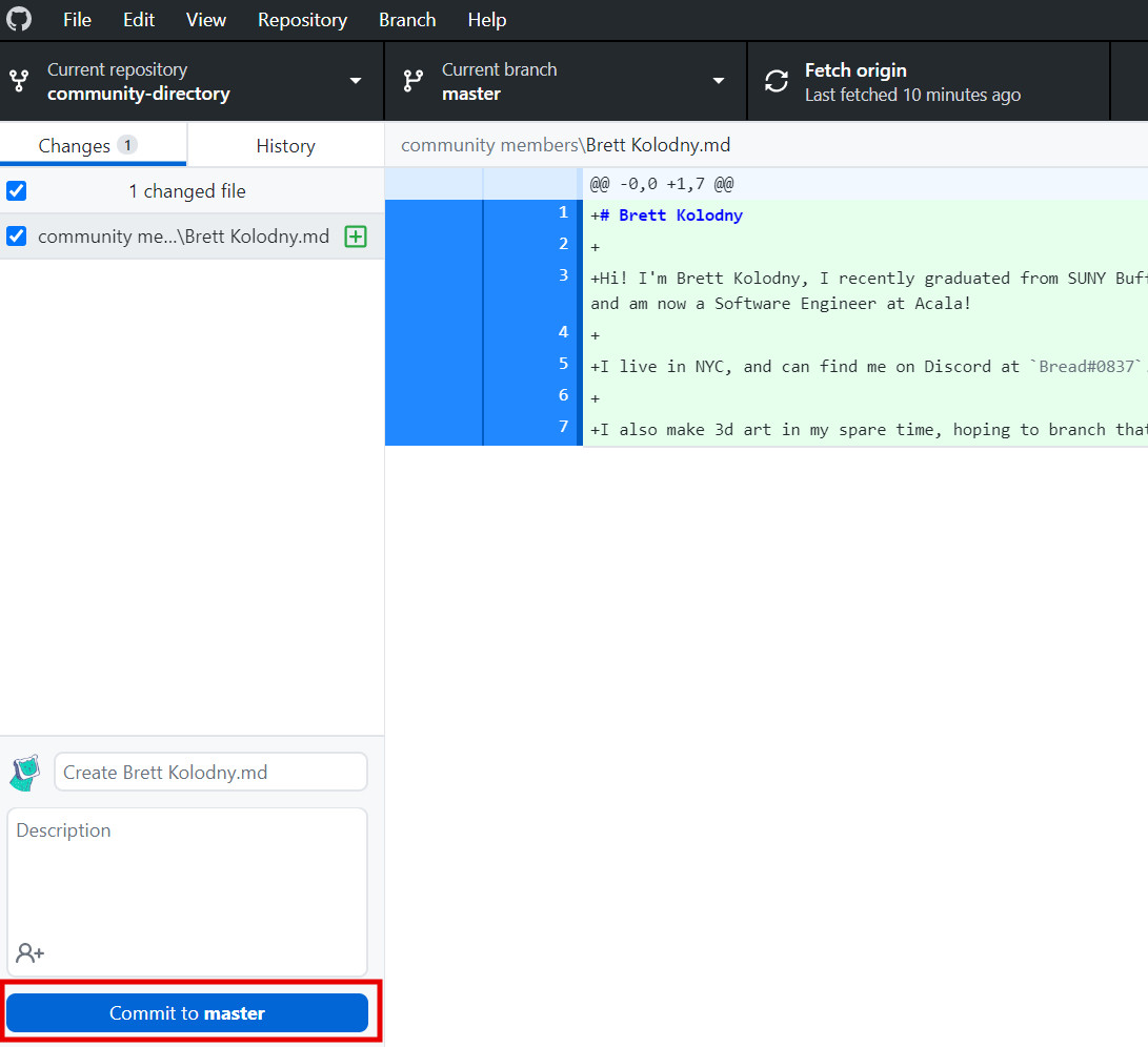 You have now added content to your fork and are ready to have your new file incorporated into the original repository!