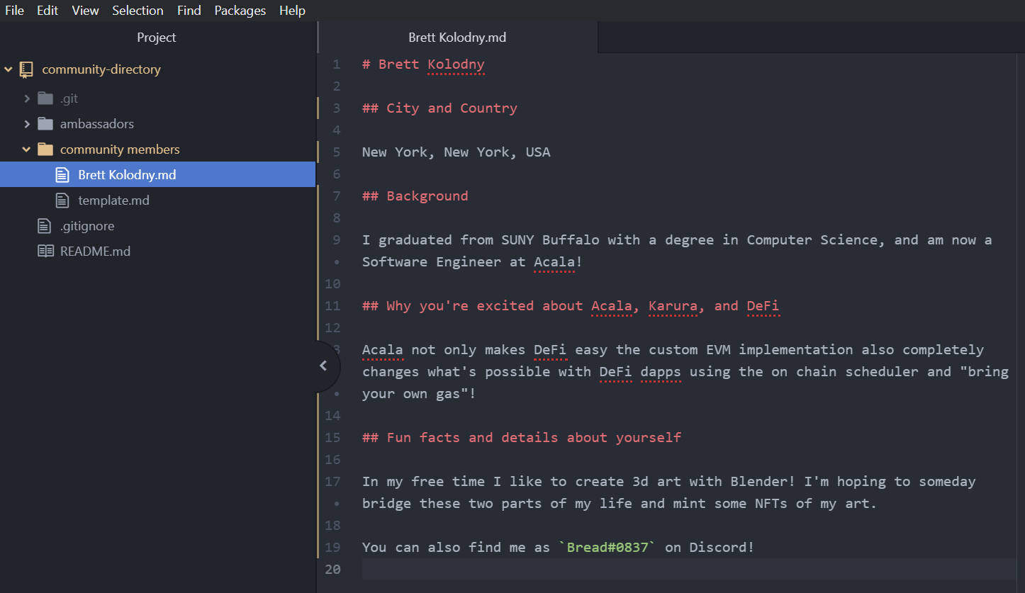 Open up the repository folder in your editor and create a new new file in the appropriate folder (ambassadors in ambassadors, community members in community members). Name the file <Your Name>.md.