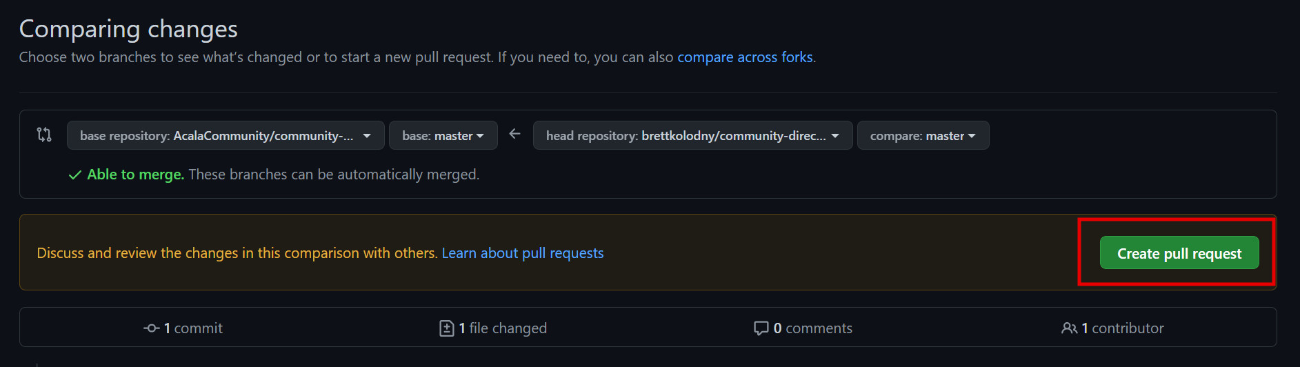 On this page you'll see the changes you've made to the repository and how they compare to what is currently in the original repository. Press Create pull request.