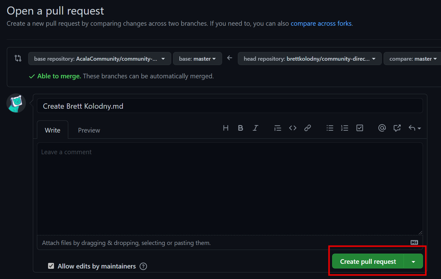 Press Create pull request one last time to open a pull request! Once your request has been reviewed it will be merged into the original repository!