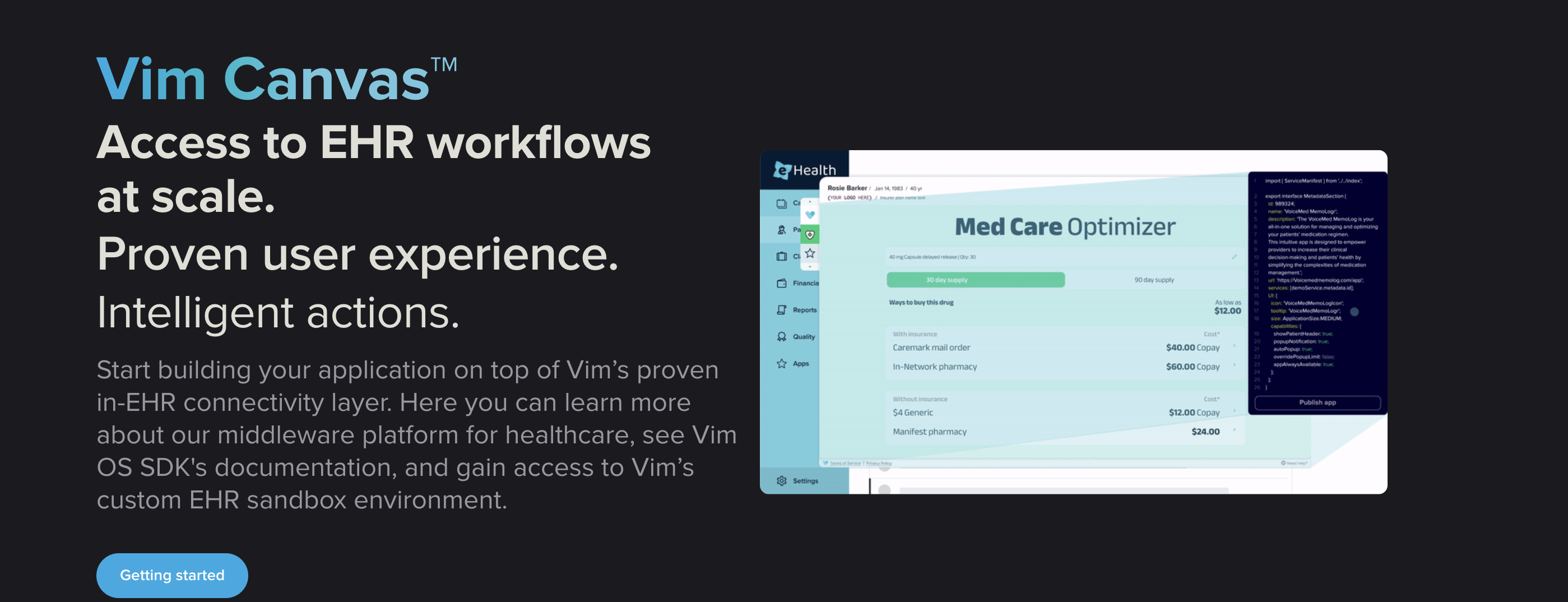 Vim is the middleware platform for healthcare. Vim Canvas™️ is a self-service platform that empowers application developers to embed their application into Electronic Health Record (EHR) workflows, resulting in a streamlined and low-friction experience for end users. With Vim, you can deploy your applications on top of Vim Connect - Vim's in-EHR connectivity layer - accelerating time to market at reduced cost and improved flexibility.