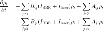 are the spontaneous emission and stimulated emission Einstein coefficients, respectively. The subscripts i and j are used to indicate the quantum state. The states are sorted in the ascending order by the state energy. Therefore, when i < j, the energy of state i is less than state j.