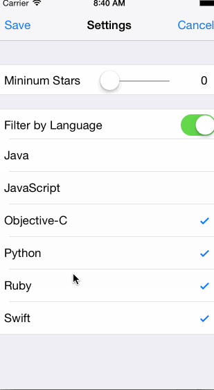 The settings view controller should have a single setting for the minimum number of stars a repo needs to have.