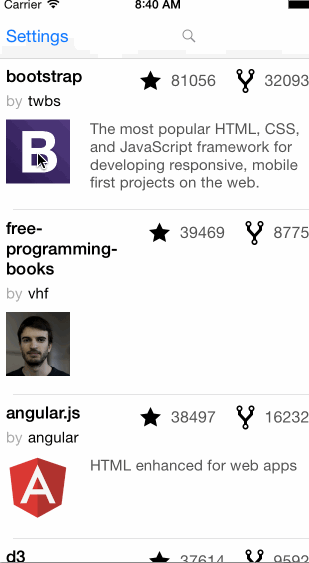 - The cell should display the name, owner, stars, forks, and description as well as the owner's avatar.
