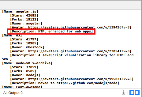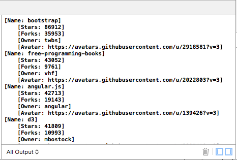 GithubDemo.xcworkspacefile and run the app. - You should see a list of GitHub repositories and their details printed in the console: