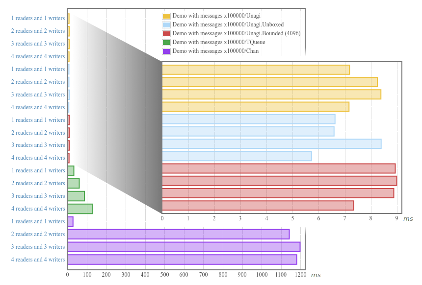 Here is an example benchmark measuring the time taken to concurrently write and read 100,000 messages, with work divided amongst increasing number of readers and writers, comparing against the top-performing queues in the standard libraries. The inset graph shows a zoomed-in view on the implementations here.