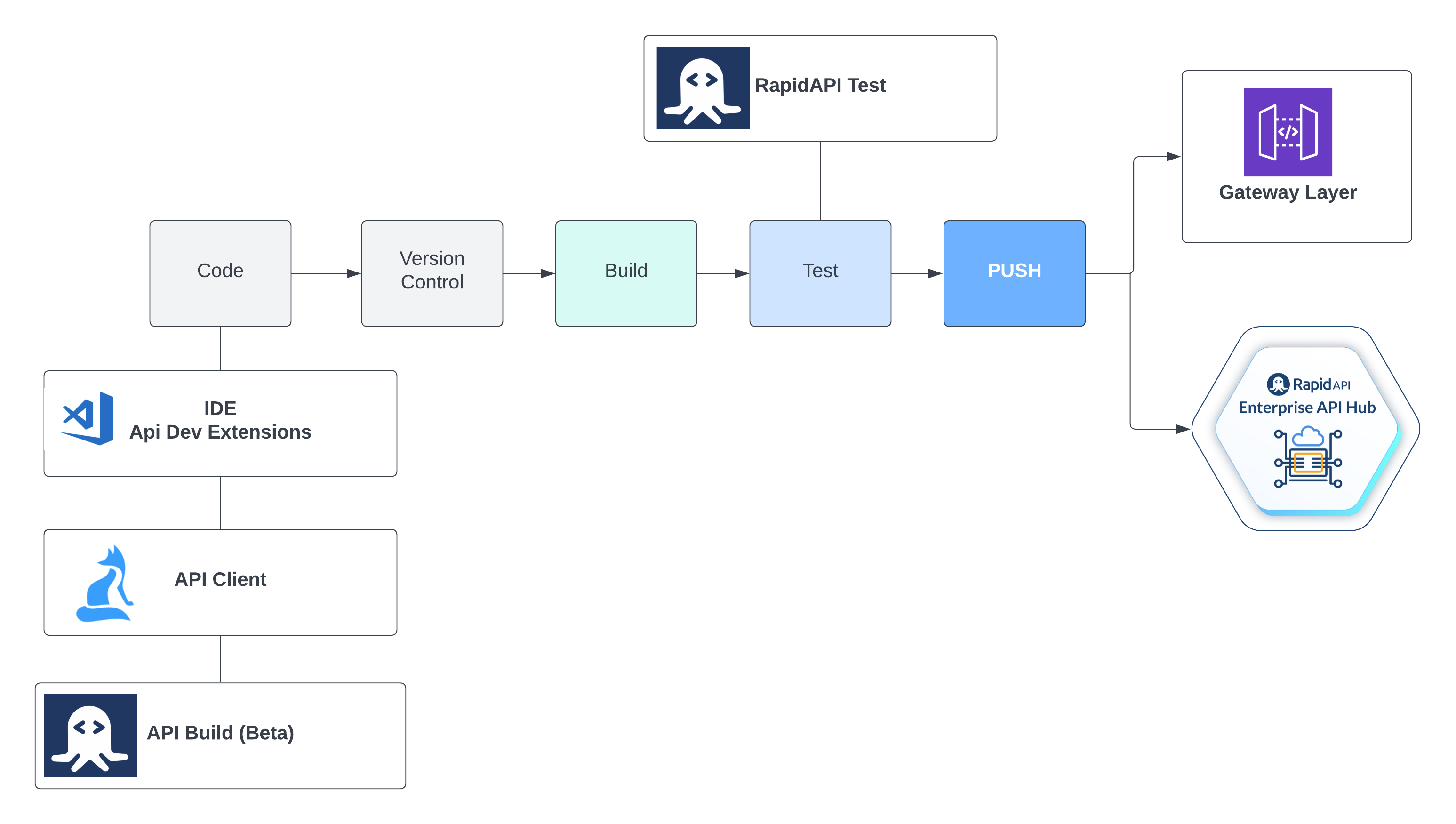 The demo starts off with showing a Python Flask API. We will run the API on localhost. From there, we can use Paw and the VSCode Extension to test the API running on localhost. Once we are ready to make a commit to master, the Github Actions workflow will deploy the API on a Heroku service, then publish the updated OpenAPI Spec to RapidAPI Enterprise hub, and then run Integration Tests on the deployed API.