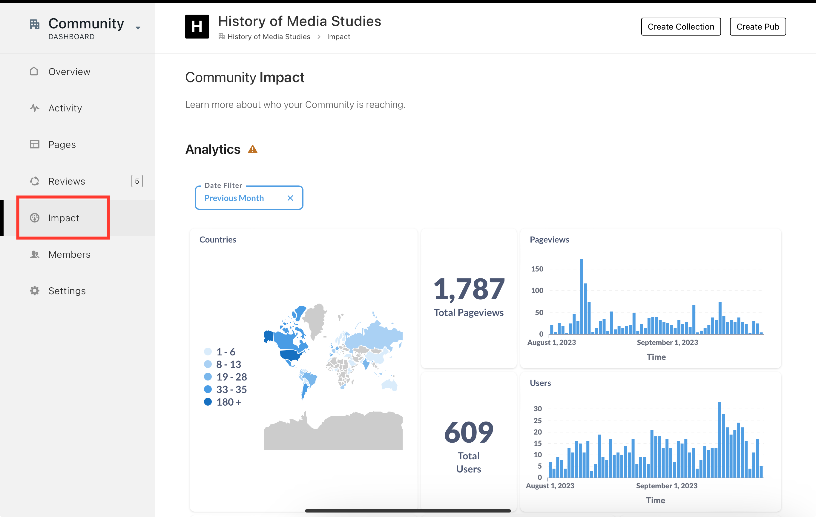 Hi Karen, You can view analytics at the Community, Collection, and Pub level. There is an Impact tab in each of those Dashboard views. (see screenshot). Cheers! Jeff