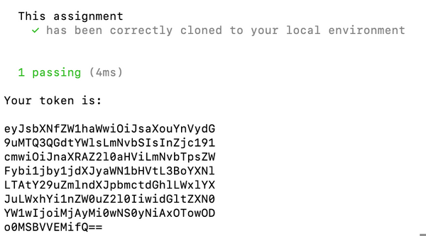Note that, by cloning this assignment down, you've already passed the test! The other thing to notice in the screenshot above is that, once all the tests are passing (in this case it's just the one), you will also see a token printed in the test output. This token indicates that you have successfully passed all the tests for the lab.