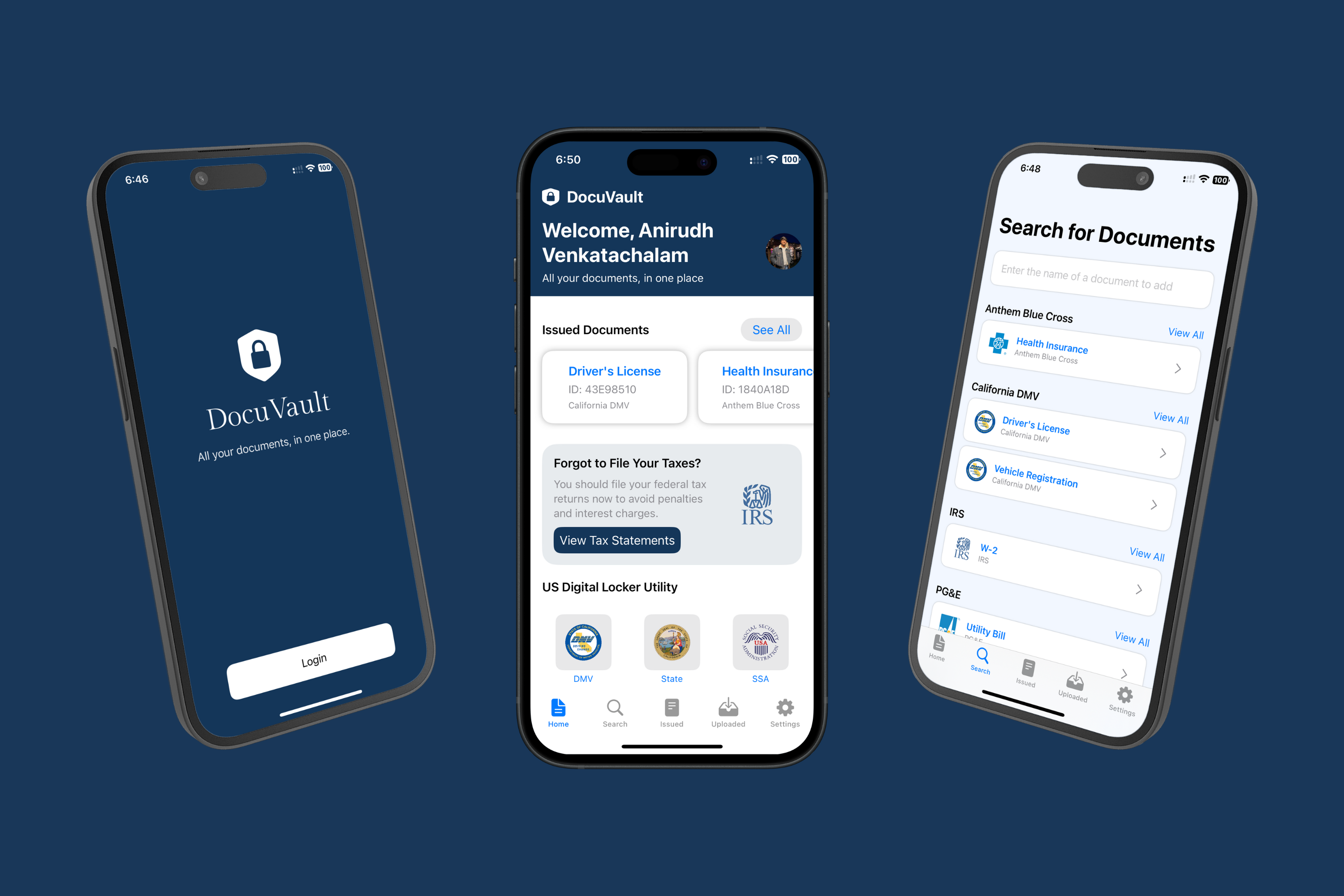 Important Note: DocuVault is a prototype created for HackDavis 2025 to demonstrate the concept of unified document management. This is not a production application and has no affiliation with any government agencies, financial institutions, or document issuers (DMV, IRS, SSA, insurance providers, etc.). All branding elements and references are used for demonstration purposes only.