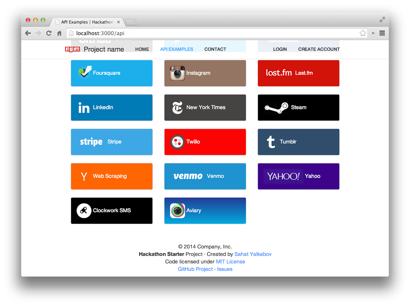Hackathon Starter 2.0 Update: I have included dummy keys and passwords for all API examples to get you up and running even faster. But don't forget to update them with your credentials when you are ready to deploy an app.