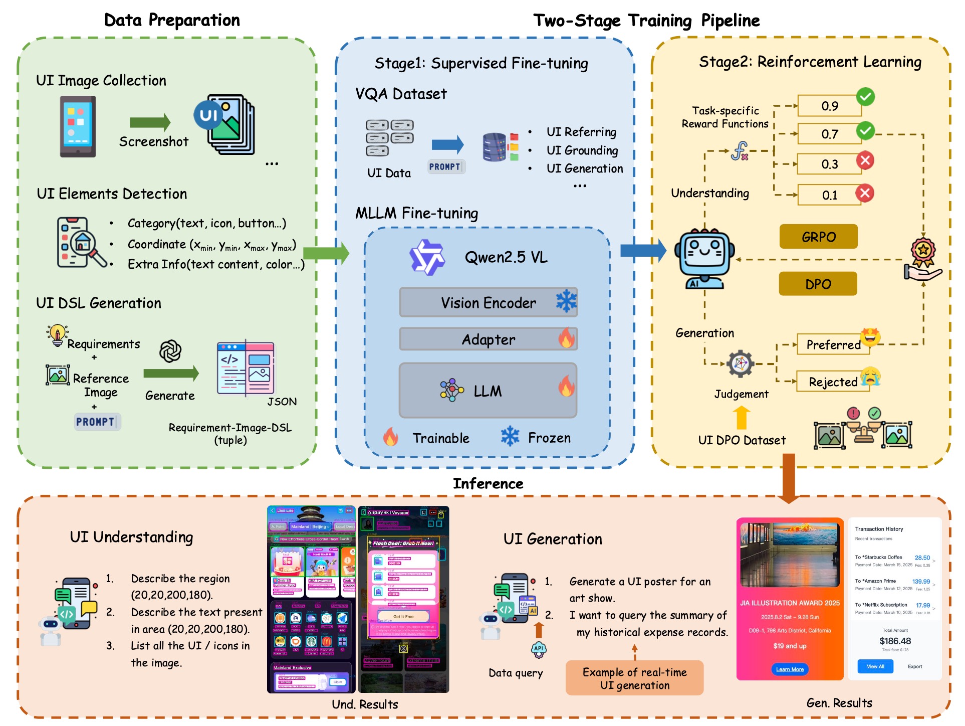 Figure 1: Overview of UI-UG. The workflow includes 1) Data preparation (UI image collection + element detection + DSL generation); 2) Two-stage training: SFT with VQA dataset, then RL optimization using GRPO and DPO for each task. The model supports UI understanding tasks (referring and grounding) and enables both offline and real-time UI generation.
