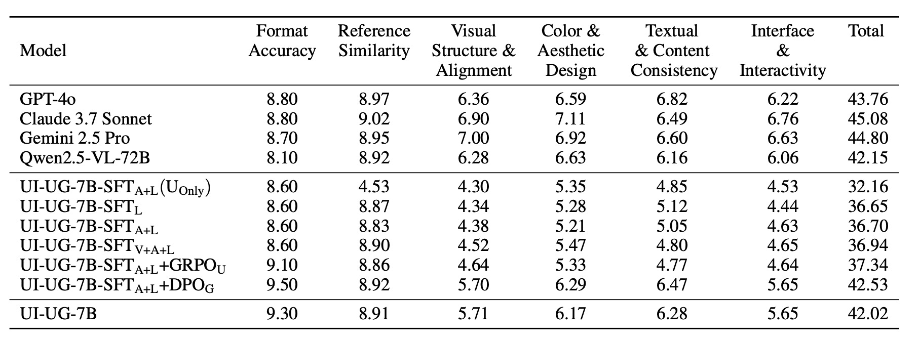 Generation | UI code generation | JSON format accuracy, LLM-based judgement (following Web2Code) |