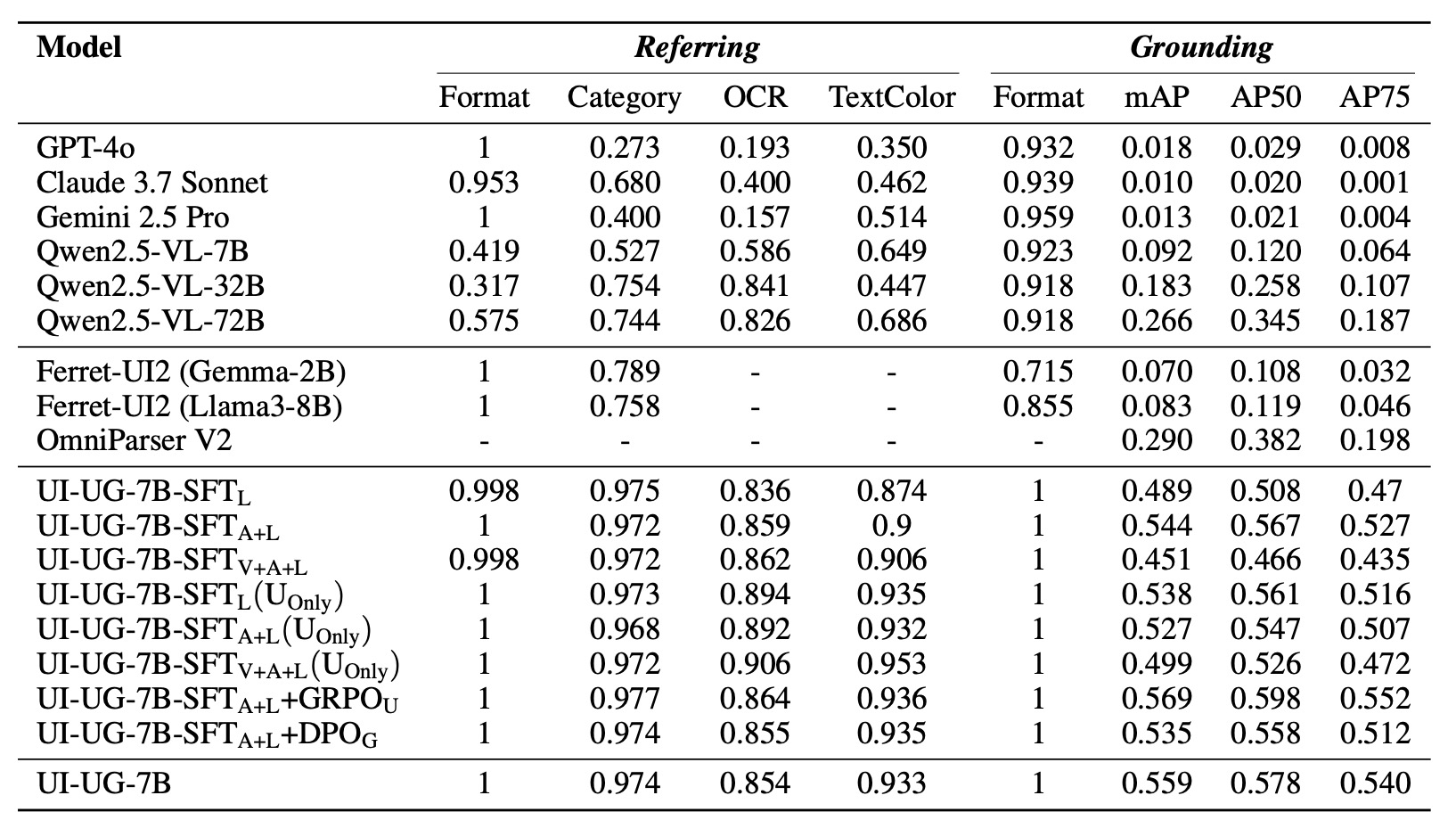 Grounding | UI element detection and localization | JSON format accuracy, mAP, AP50, AP75 |