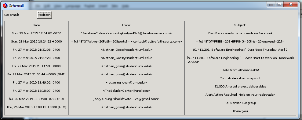 For this exploration, I used the racket/gui library, along with a collection of libraries needed for email access to make a simple email client. I first created the necessary getters for accessing the email information, and then I constructed the gui for the client which will fetch and display the ten most recent emails in your inbox.