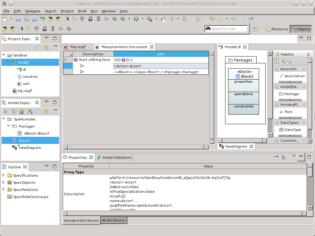 We assume that you have openETCS installed, and open with a ProR requirements model and a SysML model.
