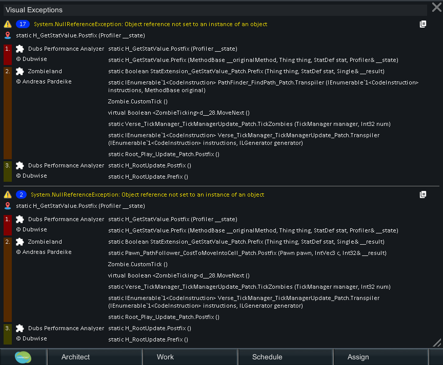 - clicking on the yellow triangle will suppress this particular exception until you restart RimWorld