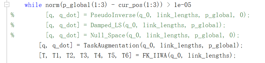 I try to run the Main_PseudoInv.m, and switch to other methods like Damped_LS or Null_Space. Only the original TaskAugmentation succeed, but other methods just can't finish with running for a whole night.